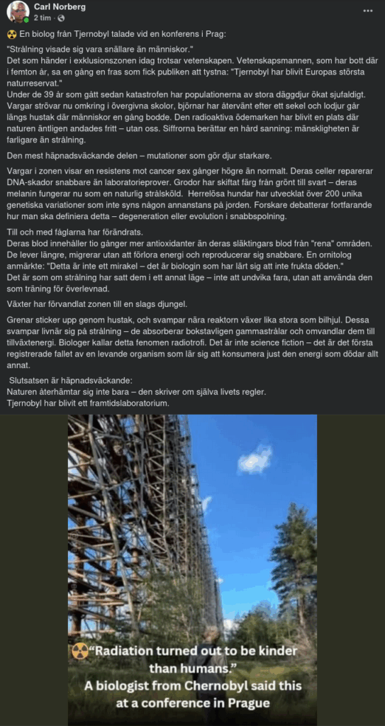 En biolog från Tjernobyl talade vid en konferens i Prag: "Strålning visade sig vara snällare än människor." Det som händer i exklusionszonen idag trotsar vetenskapen. Vetenskapsmannen, som har bott där i femton år, sa en gång en fras som fick publiken att tystna: "Tjernobyl har blivit Europas största naturreservat." Under de 39 år som gått sedan katastrofen har populationerna av stora däggdjur ökat sjufaldigt. Vargar strövar nu omkring i övergivna skolor, björnar har återvänt efter ett sekel och lodjur går längs hustak där människor en gång bodde. Den radioaktiva ödemarken har blivit en plats där naturen äntligen andades fritt – utan oss. Siffrorna berättar en hård sanning: mänskligheten är farligare än strålning. Den mest häpnadsväckande delen – mutationer som gör djur starkare. Vargar i zonen visar en resistens mot cancer sex gånger högre än normalt. Deras celler reparerar DNA-skador snabbare än laboratorieprover. Grodor har skiftat färg från grönt till svart – deras melanin fungerar nu som en naturlig strålsköld. Herrelösa hundar har utvecklat över 200 unika genetiska variationer som inte syns någon annanstans på jorden. Forskare debatterar fortfarande hur man ska definiera detta – degeneration eller evolution i snabbspolning. Till och med fåglarna har förändrats. Deras blod innehåller tio gånger mer antioxidanter än deras släktingars blod från "rena" områden. De lever längre, migrerar utan att förlora energi och reproducerar sig snabbare. En ornitolog anmärkte: "Detta är inte ett mirakel – det är biologin som har lärt sig att inte frukta döden." Det är som om strålning har satt dem i ett annat läge – inte att undvika fara, utan att använda den som träning för överlevnad. Växter har förvandlat zonen till en slags djungel. Grenar sticker upp genom hustak, och svampar nära reaktorn växer lika stora som bilhjul. Dessa svampar livnär sig på strålning – de absorberar bokstavligen gammastrålar och omvandlar dem till tillväxtenergi. Biologer kallar detta fenomen radiotrofi. Det är inte science fiction – det är det första registrerade fallet av en levande organism som lär sig att konsumera just den energi som dödar allt annat. Slutsatsen är häpnadsväckande: Naturen återhämtar sig inte bara – den skriver om själva livets regler. Tjernobyl har blivit ett framtidslaboratorium.