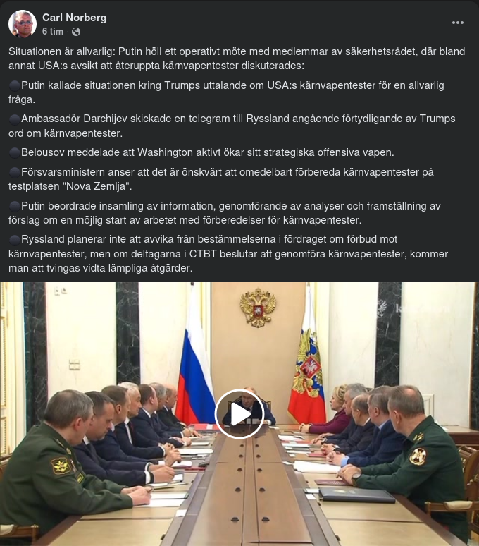 GERASIMOV: Kamrat Överbefälhavare! Det faktum att den amerikanska sidan inte ger officiella förklaringar till president Trumps uttalande om återupptagandet av kärnvapentester ger inga skäl att tro att USA inte snart kommer att börja förberedelser och sedan genomföra kärnvapentester. Den amerikanska sidan kan fortsätta att undvika officiella förklaringar, men det ändrar ingenting, eftersom om vi inte vidtar lämpliga åtgärder nu, kommer vi att förlora tid och möjligheter till ett rättidigt svar på USA:s åtgärder, eftersom förberedelser för kärnvapentester, beroende på typ, kräver från några månader till flera år. Vi känner till uttalanden från flera höga amerikanska tjänstemän om återupptagandet av kärnvapentester i USA, och analysen av dessa uttalanden pekar på Washingtons inriktning på förberedelse och genomförande.