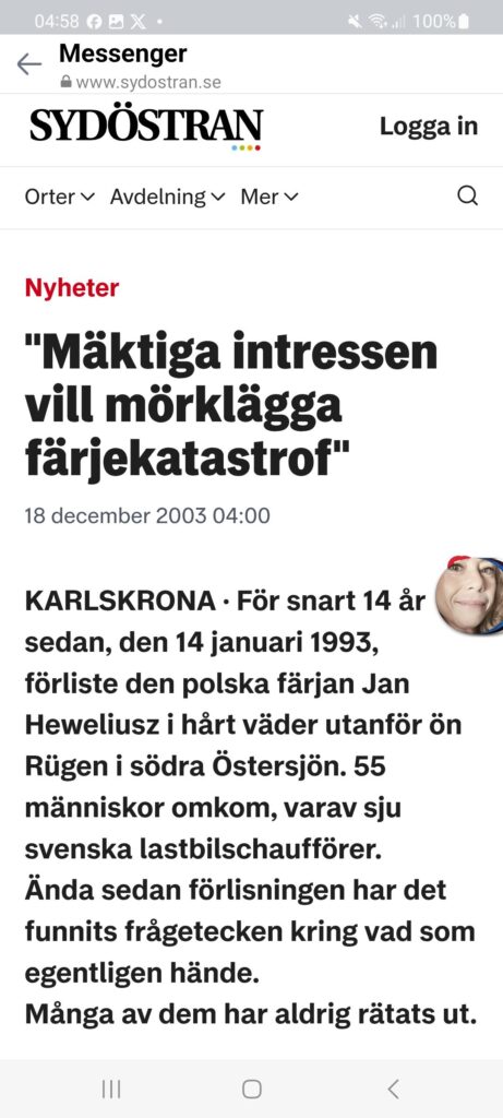 Han har visat att vissa järnvägsvagnar ombord hade last som var betydligt tyngre än vad de officiella dokumenten angav. Hans tes är att den hemliga lasten bestod av vapen som ursprungligen kom från Rumänien. Via Polen, Tyskland och Sverige skulle de slussas ut till någon okänd mottagare. Det kan låta konspiratoriskt i överkant, mena faktum är att några år efter Jan Heweliusz förlisning rapporterade både tyska och svenska tidningar om mystiska händelser kring fartygsvraket. Dykare upptäckte att ett stort hål på 25 gånger fem meter hade tagits upp i skrovets ena sida och att en del av lastbilarna ombord tömts på sin last. Så var bland annat en långtradare som enligt dokumenten skulle innehålla skruvar helt tom. Tyska myndigheter kunde inte ge någon förklaring till det som skett . Ingen hade sett någonting, trots att en operation med syfte att plocka last från vraket måste krävs stora insatser och varit dyrbar. Ända sedan det första tvivlet föddes har Marek Blus letat efter fakta hos myndigheter av olika slag, plockat pusselbit efter pusselbit som efterhand bildat ett mönster. Idag har hans material vuxit till digra luntor. Men något genomslag har hans teorier och bevis aldrig fått - varken hos myndigheter eller hos internationella media. Det är den officiella sanningen som gäller. Men Marek Blus tänker inte ge sig. Han är fast inriktad på att alla oklarheter kring Jan Heweliusz skall klarläggas. Hoppet just nu står till Europadomstolen för mänskliga rättigheter i Strasbourg. Dit har några anhöriga till omkomna på färjan drivit frågan somkan komma upp till behandling redan till våren. Och Marek Blus och förhoppningsfull. - Vi är mycket starkare nu än åren efter katastrofen när den behandlades i polska domstolar. Vi har mycket mer fakta. Nu får vi en möjlighet att presentera det som tystats ner under alla år.