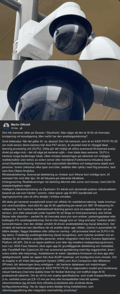 Den här kameran sitter på Slussen i Stockholm. Man säger att den är till för att övervaka broöppning vid slussöppning. Men varför har den ansiktsigenkänning? Grok bildanalys: När det gäller AI: Ja, absolut! Den här kameran, som är en AXIS P4707-PLVE (en multi-sensor dome-kamera från Axis P47-serien), är utrustad med en inbyggd deep learning processing unit (DLPU). Detta gör det möjligt att utföra avancerad AI-baserad analys direkt på edge-nivå – det vill säga på kameran själv – över båda dess sensorer. DLPU:n hanterar tunga beräkningar lokalt, vilket minskar belastningen på nätverket och möjliggör realtidsinsikter utan behov av extern server eller molntjänst.Funktionerna inkluderar bland annat:Objektklassificering: Kameran kan automatiskt identifiera och kategorisera objekt som personer, fordon (inklusive olika typer som bilar, lastbilar eller cyklar) med hög precision, tack vare Axis Object Analytics. Rörelsedetektering: Avancerad detektering av rörelser som filtrerar bort onödiga larm, till exempel från vind eller djur, för att fokusera på relevanta händelser. Intrångsvarning: Realtidsvarningar vid obehörig åtkomst eller zoner som korsas, med stöd för anpassningsbara regler. Intelligent videokomprimering via Zipstream: En teknik som dynamiskt justerar videokvaliteten baserat på vad som händer i scenen, vilket sparar upp till 80% bandbredd och lagringsutrymme utan att offra detaljer i kritiska områden. Allt detta gör kameran exceptionellt smart och effektiv för realtidsövervakning i både inomhus- och utomhusmiljöer, med stöd för upp till 4K-upplösning per kanal och 360° IR-belysning för nattseende. Den hanterar multidirektionell täckning genom sina två separata linser (en per sensor), som sitter placerade under kupolen för att fånga en bred panoramavy utan blinda fläckar eller distortion – perfekt för att övervaka stora ytor som entréer, parkeringsplatser eller butiksgolv.För ansiktsigenkänning: Det är inte inbyggt som en "plug-and-play"-funktion direkt i kamerafirmware, men den stödjer utmärkt AI-driven ansiktsdetektering (facial detection). Det innebär att kameran kan identifiera när ett ansikte dyker upp i bilden, zooma in automatiskt för bättre detaljer, flagga händelsen eller utlösa en varning – allt processat lokalt via DLPU:n för låg latens. Fullständig ansiktsigenkänning (facial recognition), som matchar ansikten mot en databas för att identifiera specifika personer, kräver integration med Axis Camera Application Platform (ACAP). Det är en öppen plattform som låter dig installera tredjepartsprogramvara, som t.ex. AXIS Face Detector (Axis egen app för grundläggande detektering och metadata) eller FaceMe® från CyberLink (för mer avancerad igenkänning med hög noggrannhet, även i svåra vinklar eller belysning). Installationen är enkel: Uppdatera firmwaren via Axis app eller webbgränssnitt, ladda ner appen från Axis ACAP-marknad, och konfigurera inom minuter. Om du kopplar in ett Video Management System (VMS) som Axis Companion eller Milestone XProtect, blir aktiveringen ännu smidigare – det hanterar databasen och matchningen automatiskt.Sammanfattningsvis är AXIS P4707-PLVE en toppmodern modell som kombinerar robust hårdvara (med sina dubbla linser för flexibel täckning) och kraftfull edge-AI för professionell säkerhet. Om du vill ha mer exakta specifikationer, som exakt linsspecifikationer (t.ex. varifokal zoom på 2,8–13 mm per lins) eller kompatibilitet med ditt system, rekommenderar jag att kolla Axis officiella produktsida eller använda deras konfigurationsverktyg. Har du några andra detaljer kring installationen, som nätverksuppsättning eller integration med befintlig utrustning?