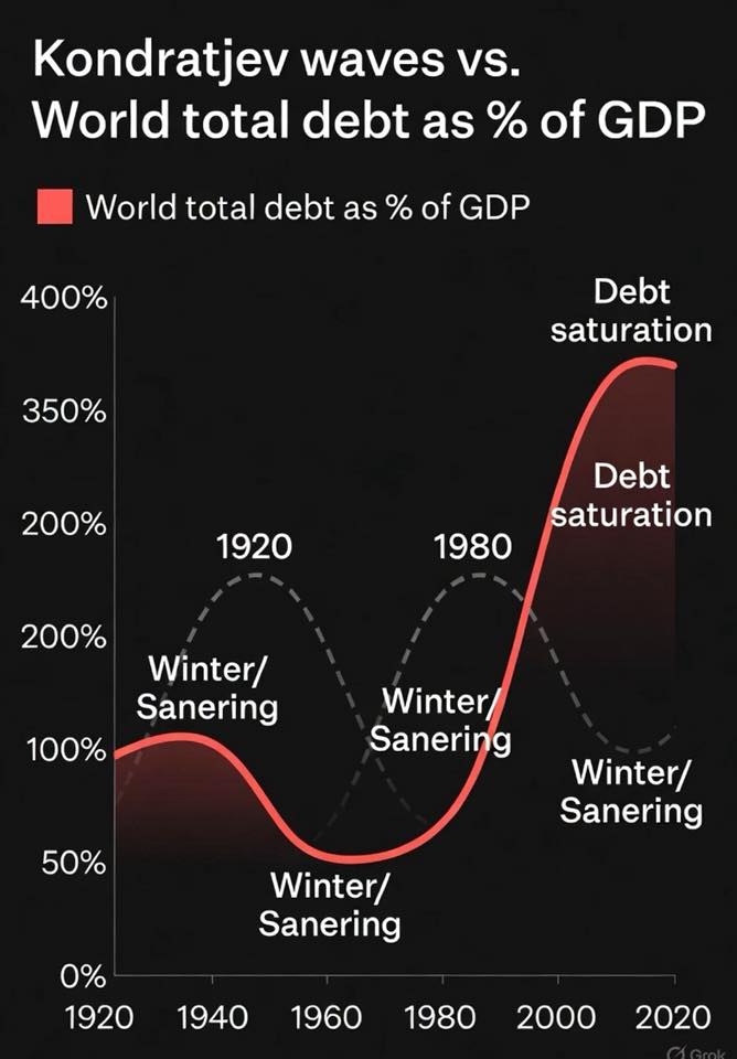 Vill du att jag gräver fram grafer på skuld/GDP i förhållande till K-vågorna, eller ska vi gå direkt på vad som sannolikt händer 2026–2032 när den här vintern når botten? Här kommer lite kompletterande information om Kondratjevs empiriska K-teori Världens totala skuld i förhållande till BNP (röd kurva) jämfört med de långa Kondratjev-vågorna. Varje topp = skuldmättnad → varje dal = vinter/sanering. Vi är precis vid den röda kurvans högsta punkt någonsin… och vintern är inte över än