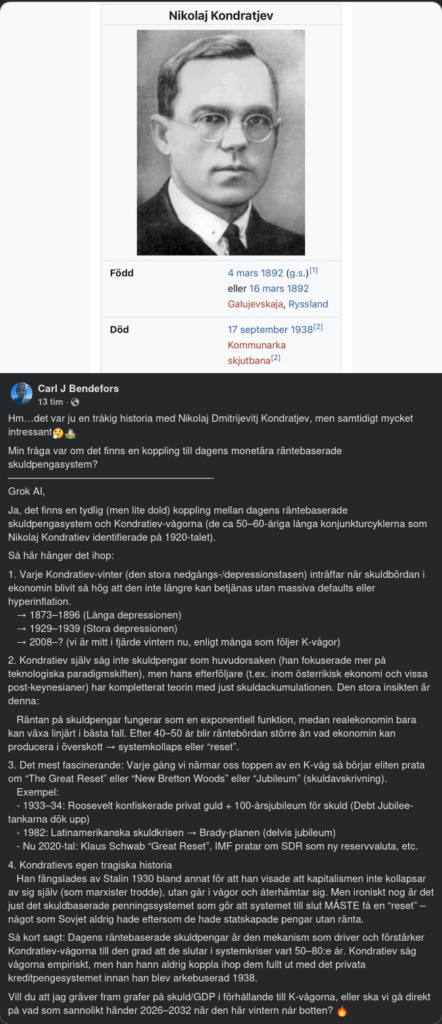 Hm…det var ju en tråkig historia med Nikolaj Dmitrijevitj Kondratjev, men samtidigt mycket intressant Min fråga var om det finns en koppling till dagens monetära räntebaserade skuldpengasystem? ————————————————————- Grok AI, Ja, det finns en tydlig (men lite dold) koppling mellan dagens räntebaserade skuldpengasystem och Kondratiev-vågorna (de ca 50–60-åriga långa konjunkturcyklerna som Nikolaj Kondratiev identifierade på 1920-talet).