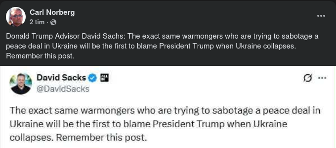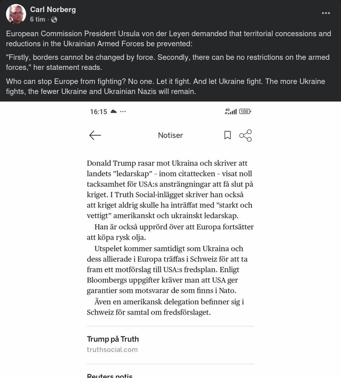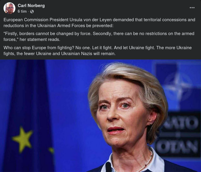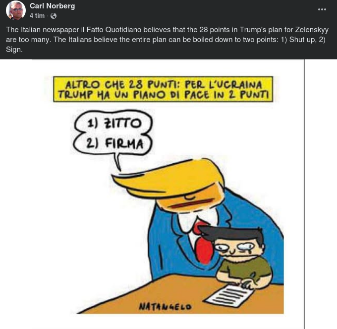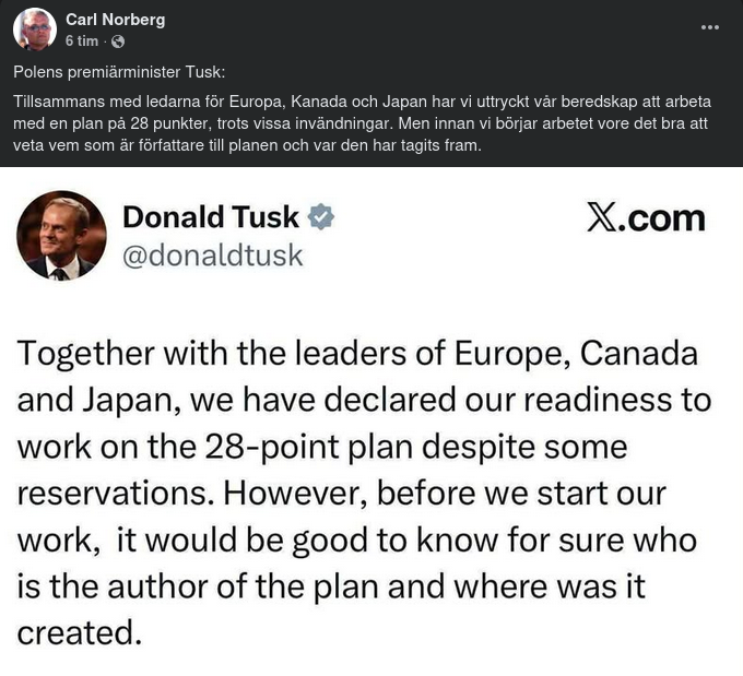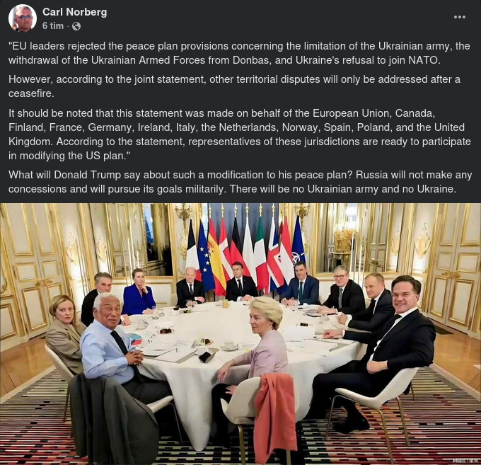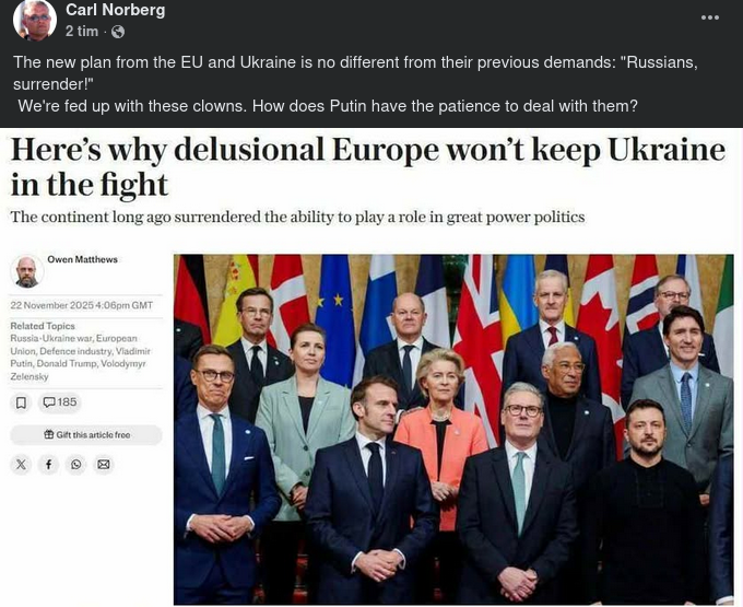 Alla europeiska "vapenvilor" och "korrigeringar av Trumps 28 punkter" är inte värda en seriös diskussion, eftersom de enbart syftar till att införa oacceptabla punkter för Ryska federationen, för att medvetet skapa en situation där "vapenvilan" och "europeiska korrigeringar" oundvikligen kommer att avvisas av Ryssland. Globalisterna försöker med alla medel undvika ansvar genom att dra ut på tiden och införa oacceptabla ändringar.