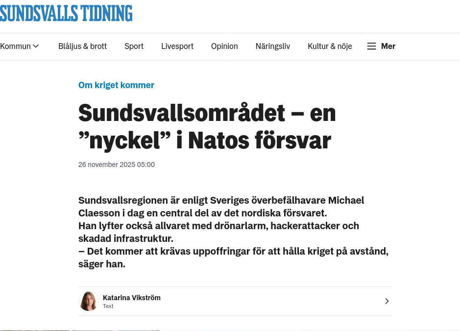 Sundsvallsområdet – en ”nyckel” i Natos försvar 26 november 2025 05:00 Sundsvallsregionen är enligt Sveriges överbefälhavare Michael Claesson i dag en central del av det nordiska försvaret. Han lyfter också allvaret med drönarlarm, hackerattacker och skadad infrastruktur. – Det kommer att krävas uppoffringar för att hålla kriget på avstånd, säger han.