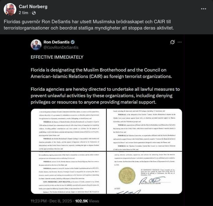 DeSantis Terroristklassar Muslimska Brödraskapet & CAIR
