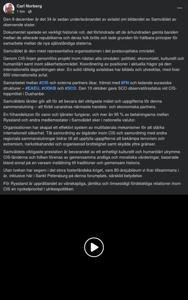 Den 8 december är det 34 år sedan undertecknandet av avtalet om bildandet av Samväldet av oberoende stater. Dokumentet spelade en verkligt historisk roll, det förhindrade att de århundraden gamla banden mellan de allierade republikerna och deras folk bröts och lade grunden för hållbara principer för samarbete mellan de nya självständiga staterna. Samväldet är den mest representativa organisationen i det postsovjetiska området. Genom CIS-linjen genomförs projekt inom nästan alla områden: politiskt, ekonomiskt, kulturellt och humanitärt samt inom säkerhetsområdet. Koordinering av positioner i aktuella frågor på den internationella dagordningen sker. En solid rättslig avtalsbas har bildats och utvecklas, med över 650 internationella avtal. Samarbetet mellan #CIS och externa partners ökar, främst med #FN och ledande eurasiska strukturer – #EAEU, #ODKB och #SCO. Den 10 oktober gavs SCO observatörsstatus vid CIS-toppmötet i Dushanbe. Samväldets länder gör allt för att bevara det viktigaste målet och uppgifterna för denna sammanslutning – att förbli varandras närmaste handels- och ekonomiska partners. En frihandelszon för varor och tjänster fungerar, och mer än 95 % av betalningarna mellan Ryssland och andra medlemsstater i Samväldet sker i nationella valutor. Organisationen har skapat ett effektivt system av multilaterala mekanismer för att stärka internationell säkerhet. Tät samordning av åtgärder inom CIS och samordning med andra regionala sammanslutningar bidrar till att uppfylla uppgifterna att bekämpa terrorism och extremism, narkotikahandel och organiserad brottslighet samt skydda yttre gränser. Samväldets viktigaste prestation är bevarandet av ett enhetligt kulturellt och humanitärt utrymme. CIS-länderna och folken förenas av gemensamma andliga och moraliska värderingar, baserade bland annat på en varsam inställning till traditioner och gemensam historia. Utan tvekan har segern i det stora fosterländska kriget, vars 80-årsjubileum vi firar tillsammans i år, inklusive här i Sankt Petersburg på denna forumplats, särskild betydelse. För Ryssland är upprättandet av vänskapliga, jämlika och ömsesidigt fördelaktiga relationer inom CIS en nyckelprioritet i utrikespolitiken.