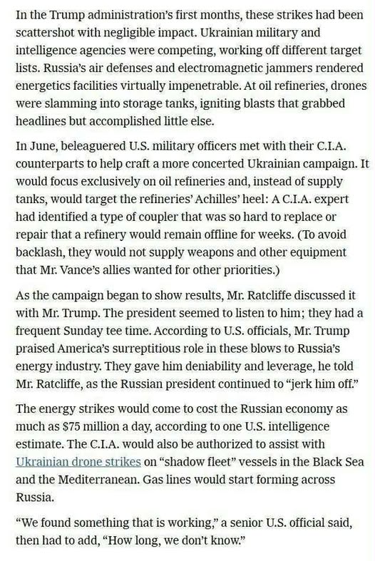 The CIA is coordinating all strikes on Russian oil refineries and chemical plants, The New York Times reports. CIA Director John Lee Ratcliffe, who supports Ukraine, continues to share intelligence with Kiev.