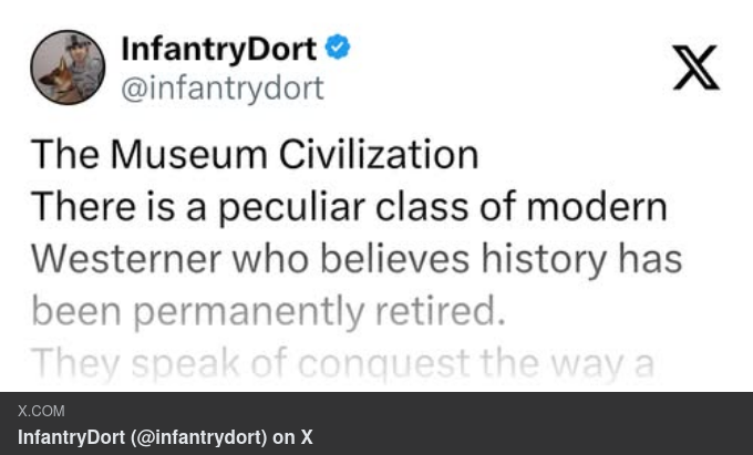 Museicivilisationen Det finns en säregen klass av moderna västerlänningar som tror att historien har lagts på is permanent. De talar om erövring på samma sätt som ett barn talar om vargar. Helt enkelt övertygade om att den inte längre gäller, kränkta över att du ens skulle nämna det, och djupt upprörda när de påminns om att tänder fortfarande finns. De insisterar på att världen nu styrs av regler och att gränser är heliga. Och att sann makt har ersatts av pappersarbete. Denna tro är inte det minsta moralisk. Det är jävla arkeologiskt. De lever inuti institutioner byggda av våld, försvarade av män de inte längre förstår och garanterade av krafter de vägrar att erkänna. Liksom turister som vandrar i en fästning beundrar de stenarbetet medan de hånar idén om en belägring. De förväxlar ordning med natur. VARJE. ENDAST. GÅNG. Skyll sedan på personen som påminner dem om detta.