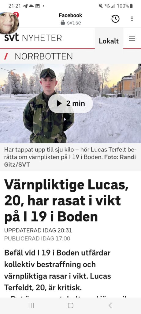 Befäl vid I 19 i Boden utfärdar kollektiv bestraffning och värnpliktiga rasar i vikt. Lucas Terfeldt, 20, är kritisk. – Det är oacceptabelt med jägarvila för att man kommer för sent, säger han. Värnpliktiga utsätts för kollektiv bestraffning på 14 av Sveriges 28 utbildande förband, visar Pliktrådets halvårsrapport. – Det här är allvarliga uppgifter och jag vet också att Försvarsmakten tar detta på allvar. Vi har en dialog kontinuerligt med Pliktrådet och det är viktigt naturligtvis för värnpliktens skull och attraktionskraft att det är bra och sjysta förhållanden, säger försvarsminister Pål Jonson om kritiken. Värnplikt Värnpliktiga i vintermiljö springer straffvarv efter att Kalle kommit sent. Rapport: Nekad vård och kollektiv bestraffning av värnpliktiga Person i träningskläder använder mobiltelefon utomhus bland träd. Elviras dröm är att göra värnplikt – tidigare ätstörning stoppar henne På I 19 har värnpliktiga bland annat beordrats att springa straffvarv i regnställ till följd av en enskild värnpliktigs försening. Orimligt många omvisitationer har också utförts efter att enskilda suttit utan huvudbonad vid soldathemmet. Hot om indragna permissioner har också förekommit. Kollektiva bestraffningar ska upphöra Pliktrådet kräver att alla kollektiva och fysiska bestraffningar upphör och att befäl och värnpliktiga utbildas i värnpliktigas juridiska rättigheter och skyldigheter.” – Vi har haft genomgångar om att det inte är acceptabelt, säger Per Juhlin, chef på pansarbataljonen i Boden. Värnpliktiga tappar vikt Försvarshälsan har också uppgett att flera värnpliktiga tappat i vikt sedan inryckning. Något man i rapporten hänvisar till problem i matsalen. Värnpliktiga Lucas Terfelt är en av dem som tappat i vikt. – Fem till sju kilo och jag tror det mesta är på grund av maten, för jag var fysiskt aktiv redan innan jag kom hit, säger Lucas Terfelt. Bodens garnison Bodens garnison består av två regementen. I 19 utbildar i dagsläget 600 värnpliktiga. A8 utbildar 350 värnpliktiga. Under nästa år ska antalet värnpliktiga på I 19 utökas med 50 stycken. Källa: Försvarsmakten