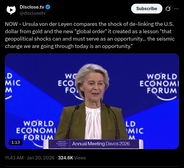 NU - Ursula von der Leyen jämför chocken av att frikoppla den amerikanska dollarn från guldet och den nya "globala ordningen" som den skapade som en lärdom "att geopolitiska chocker kan och måste fungera som en möjlighet... den seismiska förändring vi går igenom idag är en möjlighet."