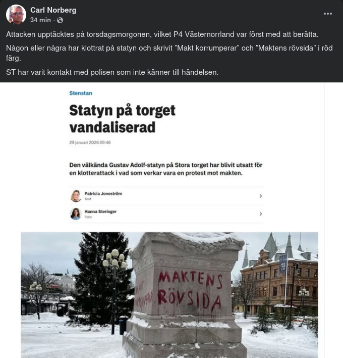 Gustav Adolf-statyn på Stora torget i Stenstan vandaliserad 29 januari 2026
