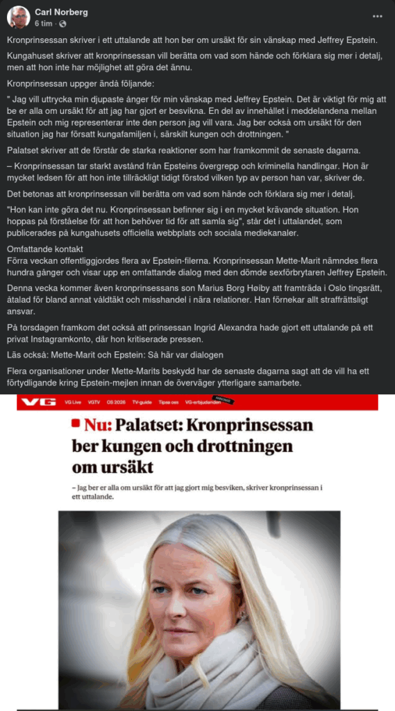 – Kronprinsessan tar starkt avstånd från Epsteins övergrepp och kriminella handlingar. Hon är mycket ledsen för att hon inte tillräckligt tidigt förstod vilken typ av person han var, skriver de.