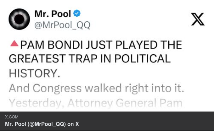 KOPPLA KOPPLARNA Måndag: Kongressen ger tillgång till Epsteins filer. Tisdag: Ledamöter letar frenetiskt efter namn. Onsdag: Bondi avslöjar att hon spårade allt. Torsdag: Demokrater blockerar DHS-finansiering. Fredag: Nedstängningen av regeringen börjar. Fem dagar. Ett mönster. PANIK. De gick in i förhöret och trodde att de hade kontroll. De gick ut och visste att Bondi hade ALLT. Varje sökning. Varje namn. Varje mörkläggningsförsök. Loggad. Dokumenterad. VAPENBESATT. Jägaren blev den jagade. Och de gjorde det mot sig själva. ⟁ FRÅN MÖRKR TILL LJUS.