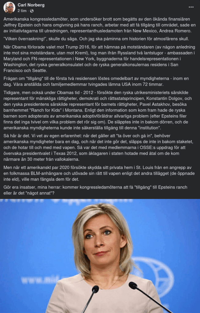Zakharova gör en poäng av att ryska försök att utreda missförhållanden mot barn på amerikanska rancher (redan 2012) blockerades helt. Genom att sedan anklaga Ryssland för att underminera amerikansk demokrati (Russiagate), skapades en rökridå.