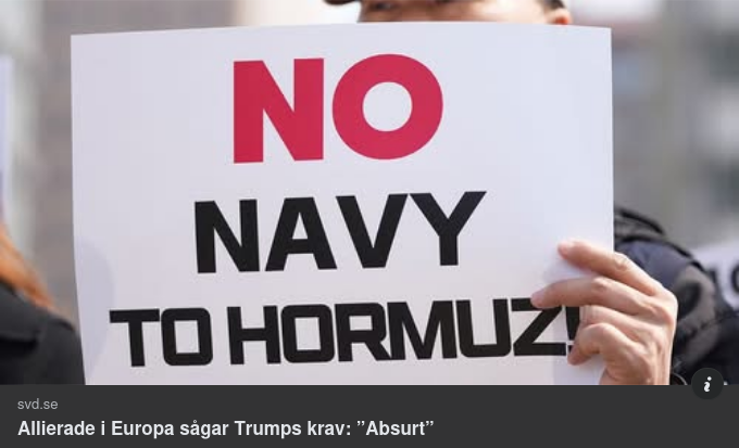 ÖB i Washington + Hormuz-pressen: Samtidigt som inrikes oro rapporteras befinner sig Sveriges överbefälhavare i USA och diskuterar hur Iran-kriget dränerar resurser från Ukraina-stödet. Trump trycker på Europa att bidra militärt i Mellanöstern. Detta skapar en bild av ett Europa som dras in i allt fler konflikter – Ukraina, nu Hormuz – medan USA kräver mer men ger mindre förutsägbarhet.I NAD-perspektivet är detta ett klassiskt exempel på varför Norden behöver neutraliseras: att undvika att bli indraget i amerikanska eller Nato-drivna operationer långt utanför Europa. En demilitariserad nordisk zon skulle slippa bidra med flottor, baser eller logistik till Hormuz eller liknande hotspots. DCA-avtalet ses här som ett verktyg som motverkar NAD-målet genom att ge USA tillgång till svenska områden och underlätta just sådan samverkan.
