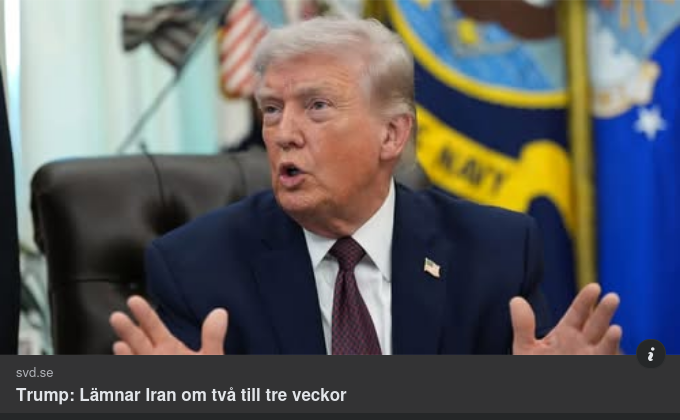 SvD-artikeln från onsdagen den 1 april 2026 beskriver en intensiv fas i **Irankriget**: nya attacker mot Teheran (norra, östra och centrala delar) och en stor explosion i Isfahan, bekräftad av iranska medier och visualiserad i Trumps Truth Social-inlägg med ett enormt eldhav. Trump signalerar att USA snart ”avslutar jobbet” – möjligen inom dagar eller två veckor – och att man därefter lämnar Iran. Han betonar att Hormuzsundet inte längre är ett amerikanskt ansvar: ”Det kommer bli för Frankrike. Det kommer att bli för den som använder sundet.” Samtidigt kritiserar han allierade för bristande stöd, medan utrikesminister Marco Rubio talar om att ”ompröva” relationen till Nato efter kriget.