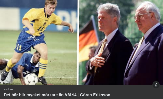 Eriksson använder 1994 som en gyllene referenspunkt: murens fall, Balkanskrig (som väst ”hanterade”), ekonomisk kris i Sverige, men ändå optimism eftersom ”ingenting var omöjligt” om Tomas Ravelli räddade en straff. Fukuyamas ”historiens slut” hyllas implicit.