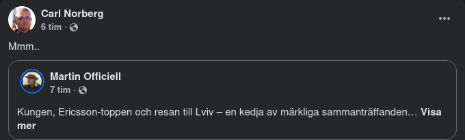 Carl Mellander, mannen i kungens bil, är som sagt styrelseledamot i MilDef – ett försvarsbolag som levererar IT-utrustning till stridsfordon 90. Maria Malmer Stenergard, utrikesministern som reste med kungen till Lviv, köpte i maj 2024 aktier i just MilDef för 10 000 kronor. Detta skedde under samma period som FMV förhandlade om en 25 miljarder kronor stor beställning av stridsfordon där Mildefs utrustning ingick.