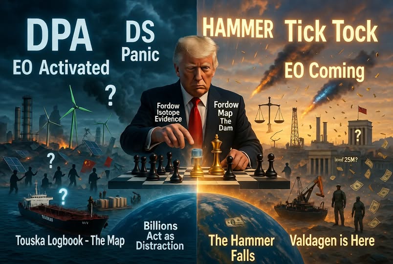 Allt hänger samman. Den gröna bluffen krossar EU och Australien medan Kinas ekonomi rasar – exakt som Trump förutsagt. DPA vänder den amerikanska energisektorn. Touska ger kartan och bevisen. Uranet ger det militära spåret mot Obama och HRC. Save America Act är distraktionen medan EO:n förbereds. RINOs och [DS] köper tid, men tiden är på Trumps sida. Tick tock.
