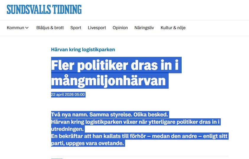 **Sundsvall – härvfabriken som aldrig sover.** Och nu har vi fått ett nytt kapitel i den långa dokusåpan ”Vem skrev under vad och när?”. Den här artikeln från ST (22 april 2026) är ren klassiker: ”Fler politiker dras in i mångmiljonhärvan” – med undertiteln ”Samma styrelse. Olika besked.” Det är som om hela kommunhuset spelar ”Den stora tystnaden” medan Ekobrottsmyndigheten långsamt drar in nätet.