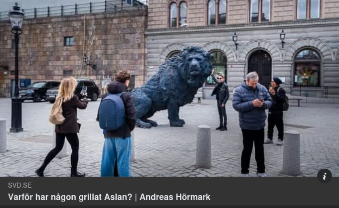 - **Malplacerad:** Invånarna på X frågar: *”Varför står det plötsligt ett stort lejon på Mynttorget?”* På samma sätt upplevs ofta Trump som malplacerad i traditionella politiska sammanhang – han hör inte hemma i etablerade, ”kungliga” miljöer, men han placerar sig där ändå, med kraft.